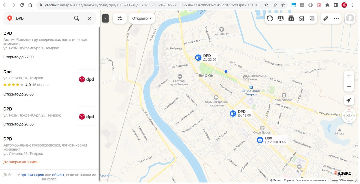 Столкнувшись с наглым обманом со стороны шараги под названием DPD, стал изучать эту контору более пристально, мне стало интересно, как можно так нагло обманывать клиентов, наплевательски к ним относиться и при этом существовать дальше, продолжать обманывать, нарушать законодательство и ужасно исполнять свою основную функцию - доставку грузов. И это касается не только меня. Данная контора имеет крайне низкие рейтинги на всех крупных площадках, в основном "довольные" клиенты ставят им одну звезду из пяти! И таких оценок тысячи. Но почему люди продолжают идти в эту ужасную шарагу? Цены у них в принципе такие же как и у конкурентов. И здесь у меня возникла мысль, возможно люди думают, что это крупная фирма, ведь если открыть любую карту, то у них практически в любом городе множество филиалов! А если крупная, то должна быть и надежная! Я сам столкнулся с этим в г.Темрюк Краснодарского края, мне нужно было отправить груз, время поджимало. Открыв карты Яндекса и 2ГИС, увидел что в г.Темрюк не