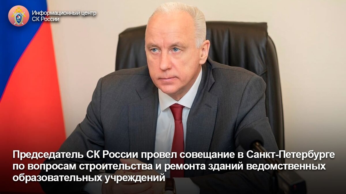 Председатель СК России провел совещание в Санкт-Петербурге по вопросам строительства и ремонта зданий ведомственных образовательных учреждений Председатель Следственного комитета Российской Федерации Александр Иванович Бастрыкин провел оперативное совещание, на котором заслушал доклады о ходе и графике проведения строительных работ и материально-технического оснащения комплекса зданий для размещения ведомственного Санкт-Петербургского кадетского корпуса. Мероприятие прошло на базе Пансиона воспитанниц СК России, в нем приняли участие директор Санкт-Петербургского кадетского корпуса – и.о. директора Пансиона воспитанниц СК России Елена Юрьевна Гаранина и сотрудники ведомственных образовательных учреждений. А.И. Бастрыкин задал вопросы о сроках выполнения поставленных задач и существующих насущных проблемах. Он еще раз обратил внимание, что при строительстве необходимо внимательно отнестись к соблюдению всех нормативов и требований. Напомним, что комплекс развернется в Старом Петерго