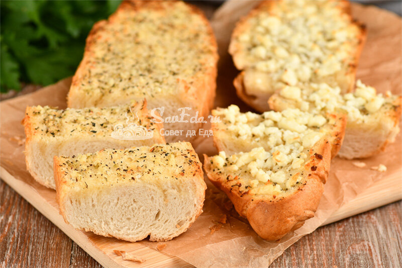 Когда хочется чего-то хрустящего и чесночного или надо реанимировать черствый хлеб, всегда готовлю это блюдо. Хруст, вкус и аромат просто замечательные. И вариантов приготовления много. Покажу 2 любимых варианта приготовления чесночного хлеба. Он отлично подходит к супам, салатам и просто на закуску. Минимум времени, минимум продуктов и максимум вкуса. Порции 4 Время подготовки 10 минут Время приготовления 8 минут Ингредиенты Инструкции 1. Можно использовать любой свежий или черствый хлеб (багет, батон, обычный хлеб и т. д.). У меня черствый багет среднего размера. 2. Багет разрезаем вдоль на 2 половинки. 3. Размягченное сливочное масло выкладываем в миску и добавляем пропущенный через пресс чеснок (2 больших зубчика). 4. Немного солим и дополняем масло любимыми свежими или сушеными травами (мне очень нравится сушеный базилик и орегано, добавляю по 1/3 ч. л.). Можно готовить со свежей петрушкой, укропом или кинзой. Тоже очень вкусно получается. 5. Хорошо перемешиваем и чесночное масло
