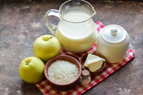 Ингредиенты: Подготовить продукты по списку. Яблоки вымыть и просушить, разрезать пополам, после удалить сердцевину. Нарезать яблоки небольшими кубиками. Рис предварительно промыть в чистой воде – 7-8 раз. После рис можно замочить в воде на 10 минут. Чистый подготовленный рис переложить в кастрюлю и залить водой, добавить щепоть соли и сахар по вкусу. Варить рис под крышкой 15 минут, на среднем огне. Влить в кастрюлю с рисом стакан молока. Снова поставить на огонь и прикрыть крышкой. Варить рис еще 10 минут на тихом огне. Добавить в рисовую кашу яблоки, варить на тихом огне 8-10 минут. В конце приготовления добавить в кашу сливочное масло и накрыть кастрюлю крышкой, настоять 10 минут и после разложить по тарелкам, подавать к столу.