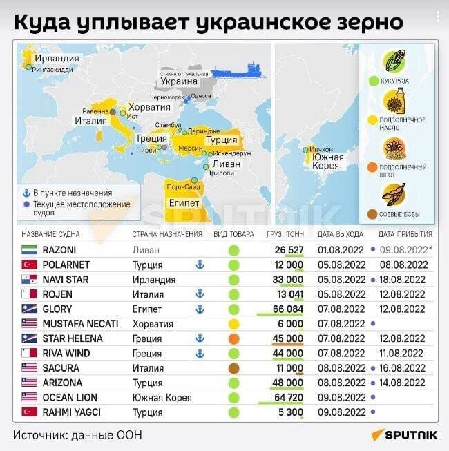 Договоренности были достигнуты, Россия корабли с зерном выпустила, только, судя по всему украинское зерно как-то особо не едет в голодающие регионы, а почему-то направляется в страны Западной Европы, где с продуктами питания и без украинских злаков все хорошо. Как мы видим из заглавной картинки, из 12 кораблей, вышедших из портов Украины с 1 по 9 августа, в Египет и Ливан, единственные стран, которые можно считать остронуждающимися, отправились только два корабля. Причем Ливан от груза уже отказался, поскольку Украина просрочила поставки зерна на 5 месяцев и сейчас корабль, по некоторым данным, видели у