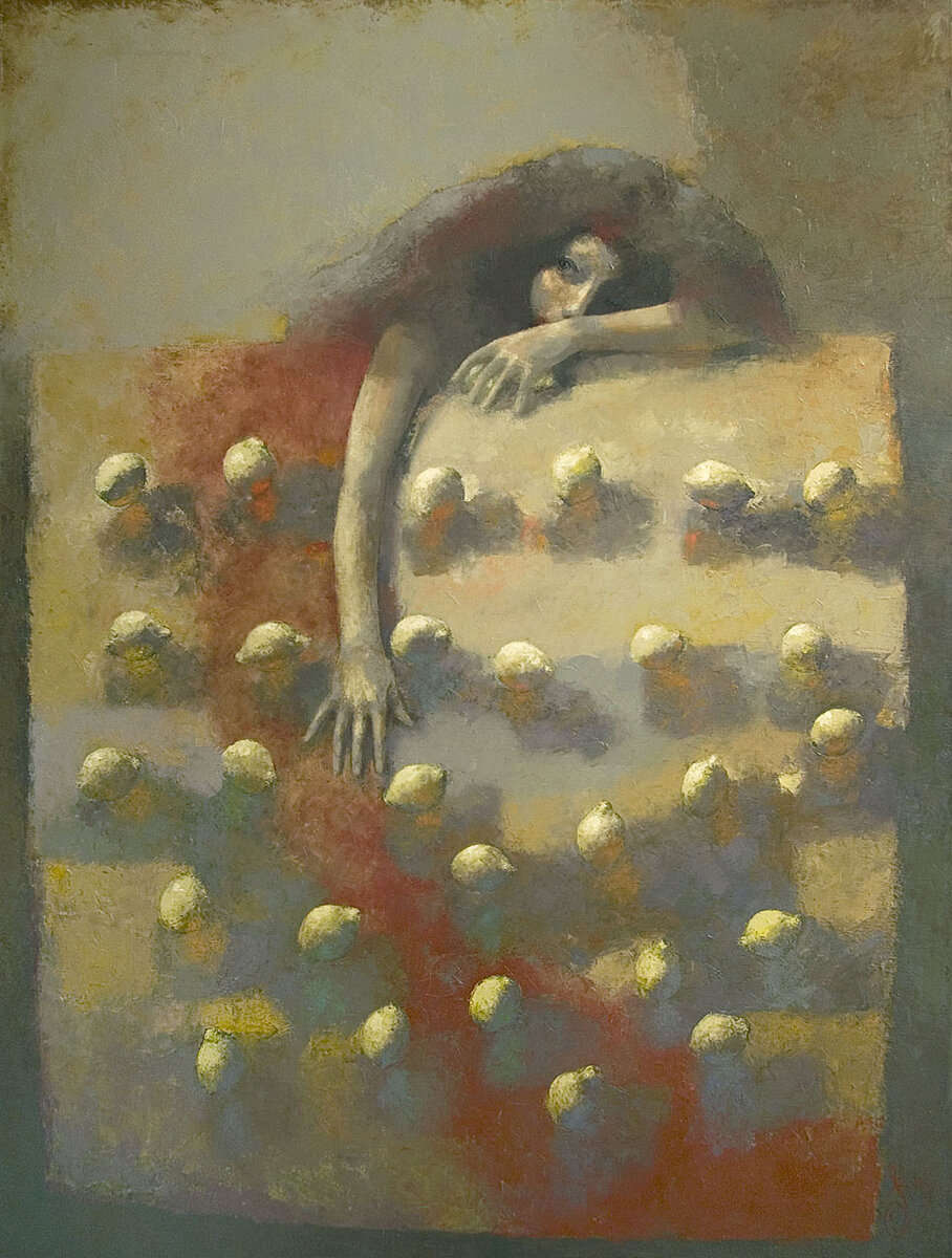 Сколько лимонов на картине? А в руке у девочки видели? Как-будто какая-то настольная лимонная игра, да? Лимоны разложены явно в каком-то порядке. Картина про детство и детскую игру? Возможно. Возможно, даже про вашу дочку или про ваше детство.