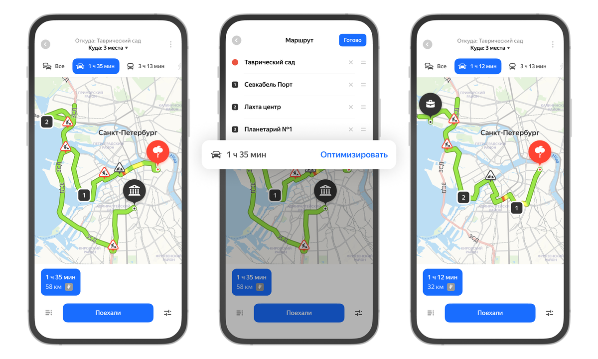 Оптимизация работает на пешеходных маршрутах, а также маршрутах на автомобиле и общественном транспорте. Автомобильные маршруты учитывают не только расположение мест, но и пробки на дорогах. Опция есть в приложении и веб-версии Яндекс Карт.