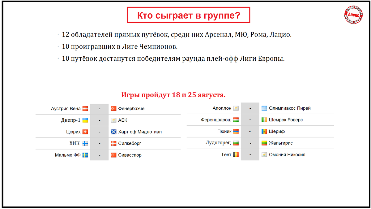 Прошли первые игры раунда плей-офф. Смотрим все результаты и расписание. Прежде стоит напомнить схему квалификации. Кто попадёт в группу Лиги Европы? · 12 обладателей прямых путёвок. Среди них Арсенал, МЮ, Рома, Лацио. · 10 проигравших в Лиге Чемпионов. · Остальные 10 путёвок достанутся победителям квалификационного раунда плей-офф Лиги Европы. ХИК – Силькеборг 1:0. Ференцварош – Шемрок Роверс 4:0 Цюрих – Хартс 2:1. Мальмё – Сивасспор 3:1. Аполлон – Олимпиакос 1:1. Пюник – Шериф 0:0. Благодарю наших подписчиков, которые поддерживают канал монеткой. Это помогает каждый день делать выпуски. Спасибо. Лудогорец – Жальгирис 1:0. Днепр-1 – АЕК 1:2. Гент – Омония 0:2. Аустрия – Фенербахче 0:2 Лучшие бомбардиры и ассистенты: Вторые игры пройдут 25 августа. Напишите, какие команды из постсоветского пространства пройдут квалификацию. Поддержите автора, если информация была полезна:
