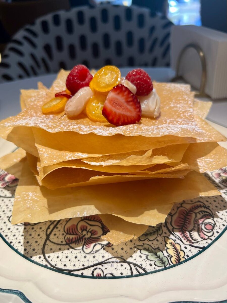 В качестве закуски мы брали Салат с копченой уткой. На горячее у нас были Кебаб ягнёнок с печёным баклажаном и Орзо с креветками и бураттой. На десерт был фирменный десерт Le sud. Надо сказать, что всё было очень вкусно. Наверное, меньше всего впечатлил десерт, но это если сильно придирчиво его оценивать. Из безалкогольных напитков очень рекомендую лимонад на безалкогольном вине с розой и личи.