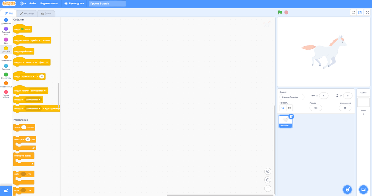 События - когда флажок нажат Внешний вид - изменить костюм на unicom running - a Внешний вид - изменить костюм на unicom running - b Внешний вид - изменить костюм на unicom running - c Внешний вид - изменить костюм на unicom running - d Внешний вид - изменить костюм на unicom running - e Внешний вид - изменить костюм на unicom running - f Управление - повторять всегда Движение - идти 10 шагов Движение - если касается края, оттолкнуться Движение - установить способ вращения влево - право Звук - играть звук Galloop до конца Звук - играть звук Horse до конца Управление - ждать 0.5 секунды Нажать на флажок