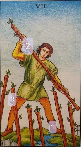 Полный образ: Семёрка Жезлов символизирует нападение на гадателя, но у последнего удачно выбранная позиция и все шансы отстоять свою правоту.