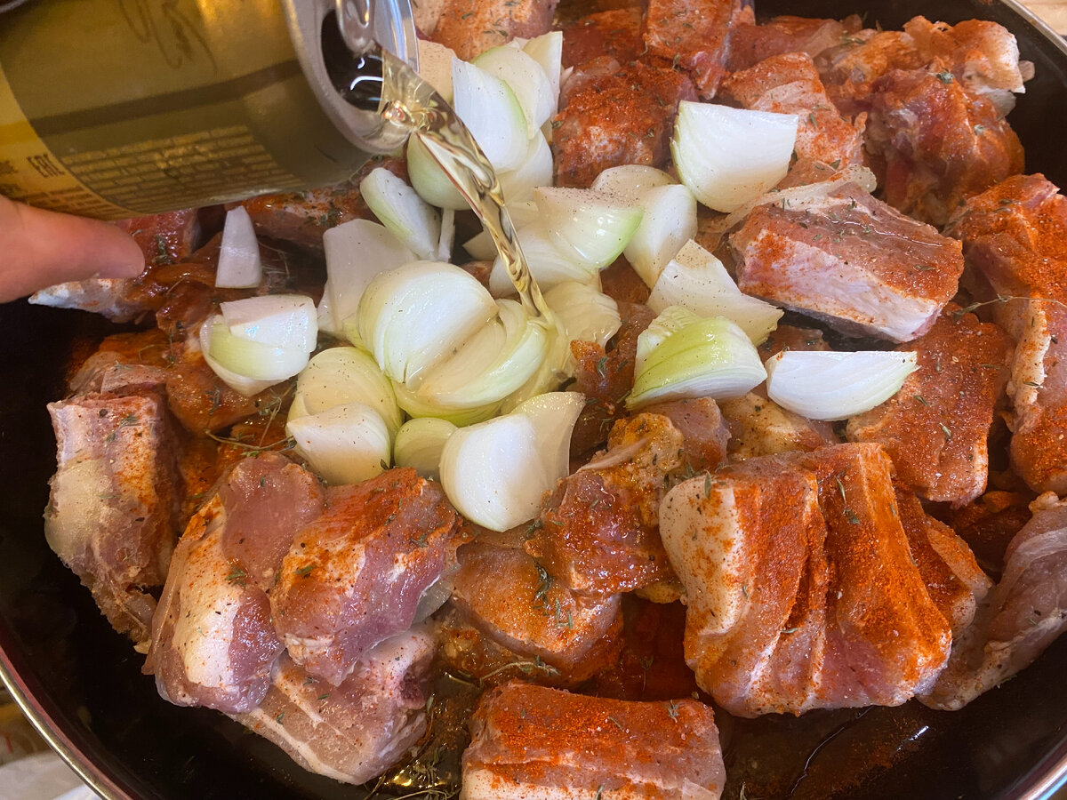 Сегодня готовим весьма простой и ленивый, но интересный рецепт свиных ребер. На эти ребра я позвал друзей, и они были в восторге, обожрались как удавы и еле еле выгнал их восвояси... Свиные ребра рецепт Начнем без лишних демагогий. Хватаем ребра и снимаем с них пленку (этот момент я почему-то не сфоткал). Без предварительной мариновки мы выкладываем их на форму для запекания и накидываем резанный лук. Солим, перчим, добавляем специи на ваш вкус (у меня это паприка и тимьян). И заливаем пивом. Пиво я взял первое попавшееся - светлое и не дорогое. Много пива лить не стоит - оно нужно для легкого аромата и чтоб ребра просто не прилипали к противню. Все это дело хорошенько перемешиваем и утрамбовываем одним слоем, чтоб ребра не лежали друг на дружке. Кстати, у меня в холодильнике завалялись помидорки черри, поэтому я решил их добавить в рецепт (не обязательно, но рекомендую). Выглядит уже красиво, правда? Подавать ребра мы будем прямо в противне, в котором запекали. Поэтому настоятельно р