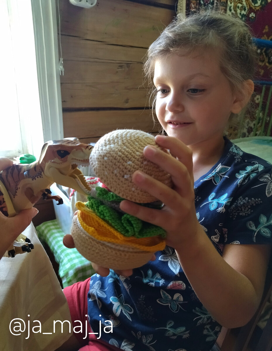 Пятница-рубрика Играем с логопедом на моём канале. Сегодня покажу вам пособие, которое оставляю "на десерт", дети его потом долго просят повторить и ждут. Вязаный полезный бургер. Вчера на занятиях с Варей и Артёмом использовала его в первый раз. С обоими детьми мы за это лето поставили звук Р и сейчас закрепляем. На каждое занятие приглашаю кого-то из героев: вчера к нам приходил Динозавр. Ведь он умеет громко рычать. Я использую фигурку из набора Лего. Первое задание: подобрать для динозавра только те ингредиенты, в которых есть звук Р. Перед детьми : 1.булочка 2. котлетка 3. Листы салата 4. Сыр 5. Помидорки 6. Огурцы 7. Перец 8. Грибы 9. Укроп 10. Колбаса 11. Колечки лука Дети учатся выделять звук Р в словах и употреблять его в речи. У Вари получился огромный бургер, но он в рот нашему Дино не влезал. Зато Ярославу-в самый раз) Ловите рецепт самого вкусного овощного бутерброда от шеф-повара Артёма. Экспресс-рецепт маленького бутерброда записали: итак, берём, помидоРки, ог