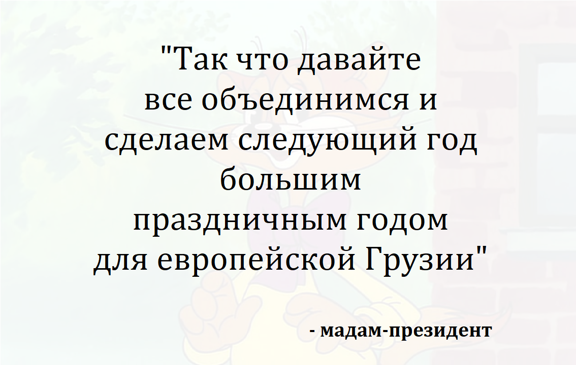 Мадам-президент обитает в своем удивительном воображаемом мире, куда не проникает грузинская реальность. На фоне растущего национализма с требованием чуть ли не запрета въезда для всех русских (по национальному признаку, обратите внимание), усугубляющейся конфронтации между правительством и оппозицией, угрозы мирового кризиса и даже голода, роста инфляции и цен на продукты, продолжающейся эмиграции молодого поколения, все большей и большей зависимости Грузии от России, а также нарастающей напряженности в обществе, которая может вылиться к концу года в массовые беспорядки - на фоне всего этого мадам-президент предлагает всем просто объединиться и... что? Зурабишвили вообще представляет, какие процессы должны произойти, чтобы Грузия хотя бы перестала катиться в экономическую, политическую и социальную пропасть? У нее есть план? Складывается ощущение, что Саломе держат в счастливой неосведомленности о том, что правительство собирается делать. Знаете, живя в княжеском дворце, и кормясь за счет государства, разъезжая по странам Европы и Азии на званые ужины, слова мадам-президента выглядят оскорбительными. Может, стоит вывести ее на улицы и показать, как живут старики на пенсию меньше $100 в месяц? Или уже не трогать пожилую женщину, которой в этом году исполнилось 70 лет. Европейская Грузия ей будет сниться по ночам, когда она сбежит из страны после окончания своего срока обратно во Францию, откуда ее, к сожалению, привез Саакашвили. А может, и раньше, ведь никто не собирается пускать Грузию даже на краешек европейского порога.