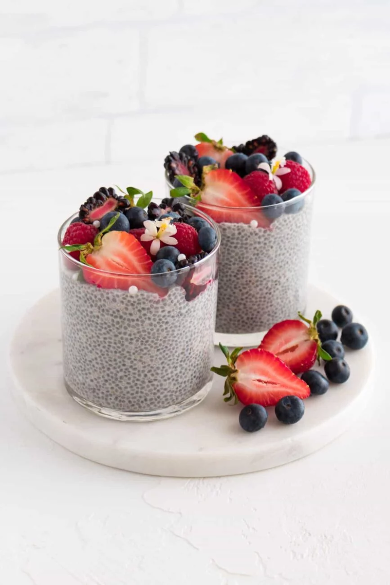 Легкий органический десерт, идеально подходящий для завтрака, сытный и максимально простой в приготовлении. Как правило, пудинг чиа – это сочетание черных семян чиа и растительного молока (такого как миндальное или кокосовое). Семена чиа замачиваются в жидкости не менее, чем на 20 минут (или в течение ночи), что создает консистенцию, напоминающую пудинг. По моему опыту, идеальное соотношение семян чиа и растительного молока составляет 1: 4. Такое соотношение каждый раз создает густую кремовую текстуру. Например: Это так просто! Следуйте этому правилу 1: 4, и ваш пудинг из семян чиа будет идеальным каждый раз. Для дополнительного подслащивания пудинга я добавляю кленовый сироп и экстракт ванили. По желанию вы можете использовать любой другой натуральный жидкий подсластитель (мёд, нектар агавы, кокосовый сироп и т.д.) А украсить такой пудинг хорошо будет свежими ягодами, такими как клубника, черника, малина и ежевика. Также можете добавить орехи или кокосовые хлопья. Ингредиенты: ДЛЯ ТО