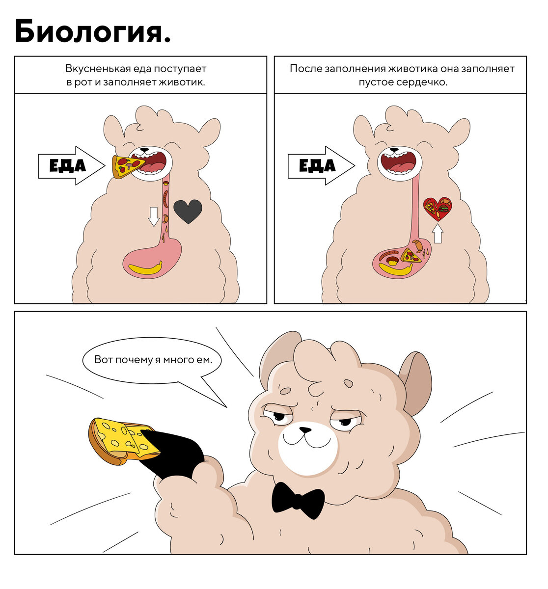 Какие бы необычные или даже странные темы для подборок комиксов я не выбирал, по итогу все равно дело не обходится и без вполне обыденных тем. Просто потому что жизненных комиксов в сети подавляющее большинство. И сегодняшняя подборка будет как никогда жизненной, ведь она посвящена той сфере, без которой не обходится существование ни одного человека. Речь, конечно же о еде. Кто-то любит покушать вкусно и много, кто-то придерживает здорового питания. Кто-то заказывает еду на дом, а кто-то готовит сам. Этому и многому другому и будет посвящена сегодняшняя статья. Надеюсь, что вам понравится! Главным героем серии комиксов Lamacomics является персонаж по имени Мистер Лама. Этому пушистому герою не чуждо ничто человеческое - он живет вполне себе обычной жизнью, и, само собой, очень любит покушать. И у Мистера Ламы даже есть научное объяснение тому, почему он частенько позволяет себе съесть больше обычного. Серия Sarah's Scribbles («Время мазни») за авторством американской художницы Сары Анд