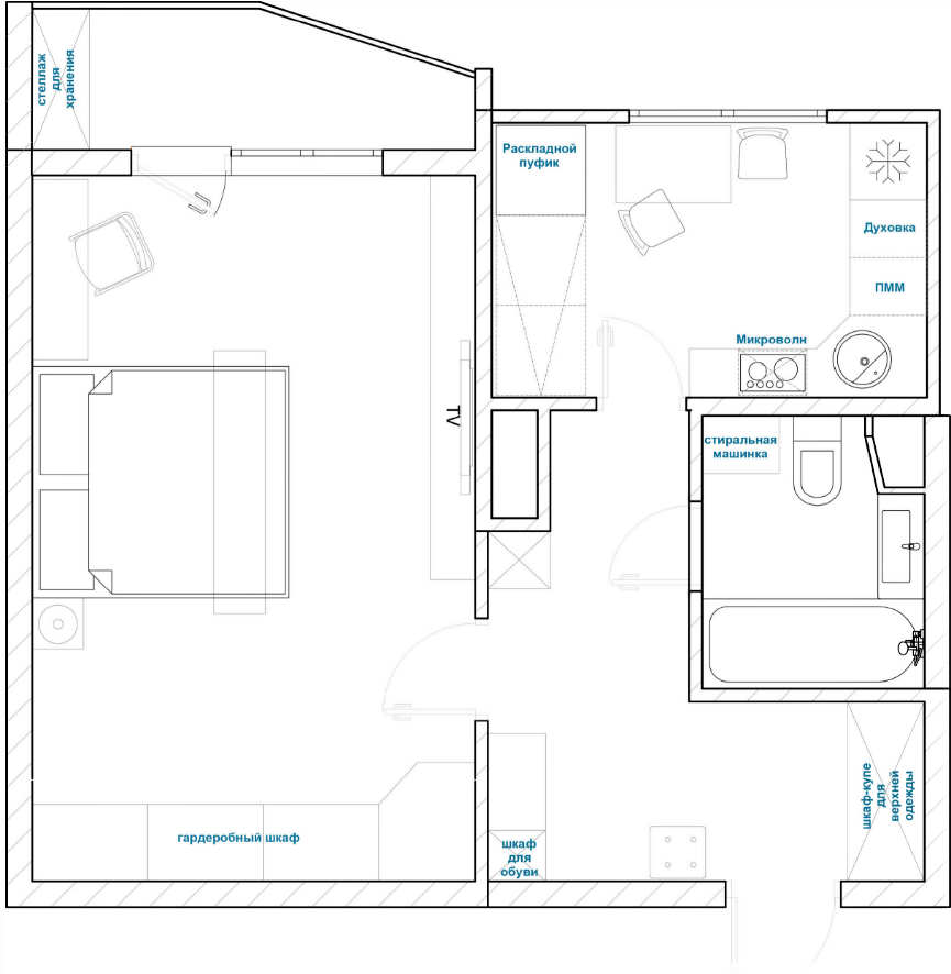 Данную квартиру наша героиня приобрела вместе с мужем пару лет назад. И так как она работает архитектором, она решила сделать квартиру собственноручно и использовать бюджетные приемы, которые можно будет потом использовать и в других проектах. Проект Прихожая Прихожая выполнена в светлых тонах. Стены оклеены рельефными обоями под покраску. На полу выложен серый керамогранит. Справа от входа расположился большой зеркальный шкаф до самого потолка, чтобы максимально рационально использовать пространство. Комната Стены в комнате тоже оклеили обоями под покраску. Напольное покрытие выложено из паркетной доски. У стены расположилась большая система хранения. Хозяйка квартиры считает, что для комфортного и здорового сна необходима кровать, поэтому посередине комнаты появилась просторная двуспальная кровать с ортопедическим матрацем. Так же у нее имеется подъемный механизм, который скрывает дополнительное место для хранения вещей. Напротив кровати расположилась ТВ-зона с модульной системой хра