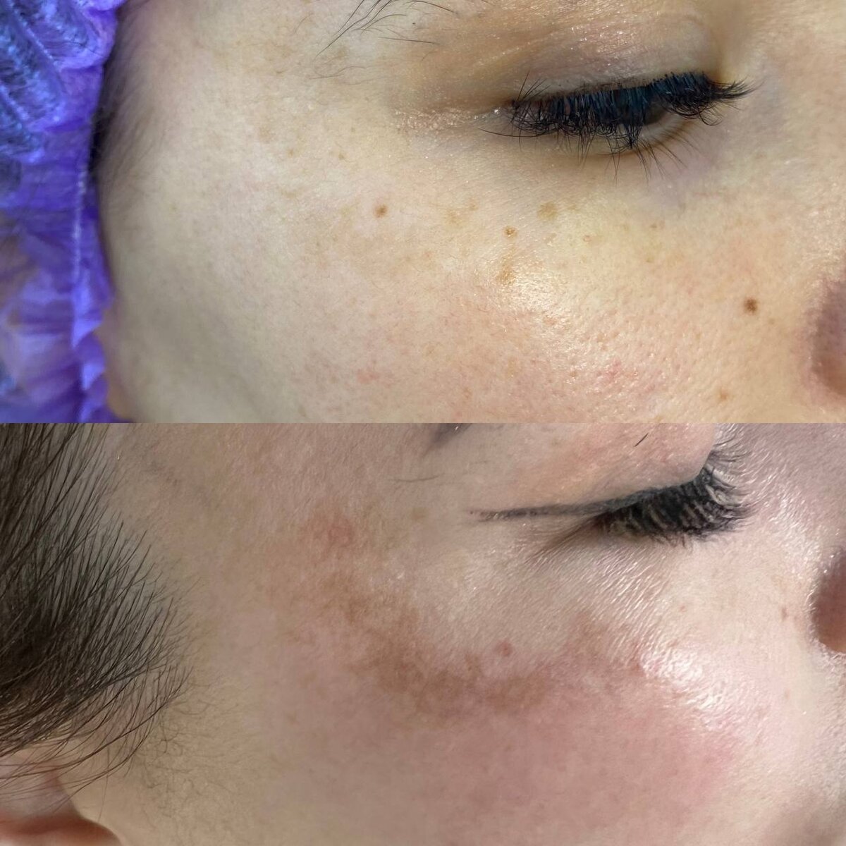 На фото в коллаже сверху #мелазма в процессе лечения в нашей клинике. Мы лечили ее мягко, без агрессии, комбинируя инъекционные и аппаратные методы.