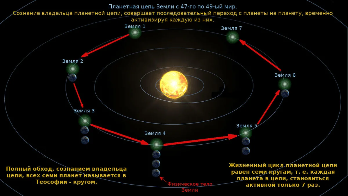 Точно таким же образом дело обстоит и с планетами входящими в состав любой планетной цепи. Активной может быть только одна планета во всей планетной цепи. В этот момент времени другие планеты, в планетной цепи, являются пассивными (спящими). Можно сказать, что сознание одного из Первых Семи существ, кому принадлежит планетная цепь, перемещается с одной планеты своей цепи на другую, как сознание человека от одного своего тела к другому. Сознание владельца, двигается по планетной цепи поочередно, от первой планеты к седьмой, когда оно обходит все семь планет в цепи, то этот процесс в Теософии называется «кругом». Когда сознание владельца цепи, сконцентрировано на какой-либо из своих планет, то она как бы «просыпается» т. е. становиться активной и (действующей). В этот момент времени её магнитное поле может увеличиваться, начинают синтезироваться различные химические элементы, появляется атмосфера, разные виды материи и живые организмы, в том числе человек. Когда же сознание владельца цепи покидает эту планету, т. е. переходит на следующую, то вся жизнь переходит вслед за ним на следующую планету, а предыдущая медленно засыпает, т.е. становиться пассивной (спящей). Это выражается в том, что существа перестают на ней рождаться, медленно увядают растения, разрушаются многие виды химических элементов, например вода и атмосфера, могут уменьшаться магнитные и гравитационные поля. В общем планета уходит в «спячку», которую в Теософии называют пралаией — периодом покоя или не активности.