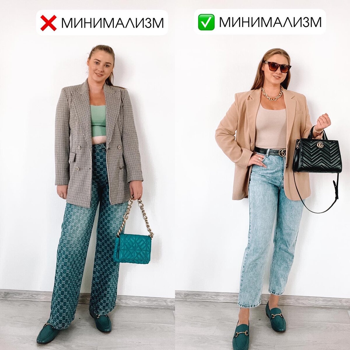 Открыта запись на «марафон стиля 3.0+ индивидуальная обратная связь! Разбираем ваш гардероб по шагам, все базовые знания «без воды» система сбора капсул и разбор стилей. Подробнее по ссылке в шапке профиля. Сегодня поговорим про любимый минимализм, как отличить его от обыденного образа? Вот, казалось бы, надела я жакет джинсы и топ…. А что-то совсем не так? Давайте разбирать! Минимализм — это прежде всего акцент на фактуру, ткань и детали в виде базовой аксессуарной группы, преимущественно использовать более нейтральные цвета, а из принта допускается лишь клетка . 1.Образ. Жакет + трендовые джинсы, топ и сумка в тон, а что не так? Всё очень просто в этом образе не соблюдена длина жакета и крой джинсов, принт перебивает друг друга ,перемещая фокус с жакета на джинсы и ,наоборот образ получается «грязным» сумка фактурная и тоже не служит связующим элементом образа, а также перетягивает внимание на себя. Во втором образе мы используем нейтральные цвета и перемещаем акцент только на акс