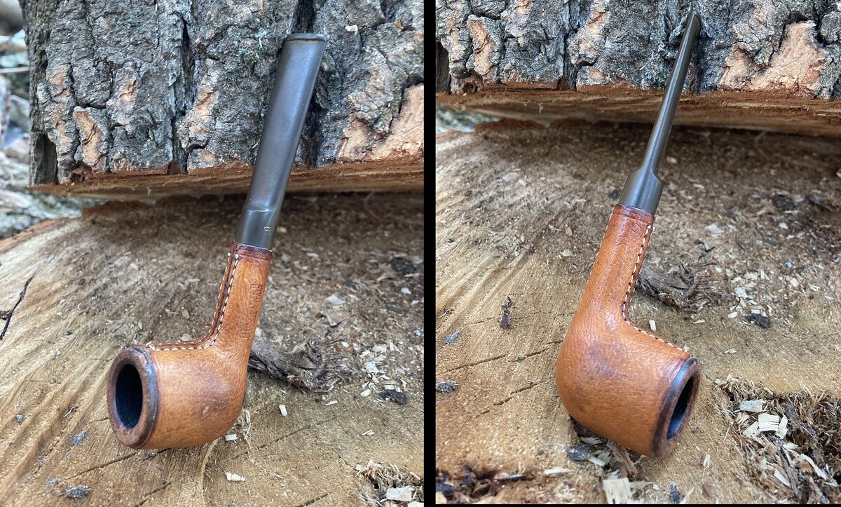 Это трубка озаглавлена как Mastercraft pigskin Italy. Снаружи не очень, поскольку кожа грязная, в царапинах, потёках и пятнах, мундштук окислен, а главное, на таком небольшом участке бриара, не прикрытого кожей, умудрились посадить забоину, скол, потёртость, сендпит и шпатлёвку! Зато состояние камеры и сверловка - на пять с плюсом.