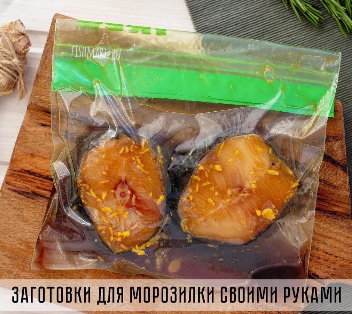 Все ингредиенты необходимо смешать до однородности, залить в пакет с zip-застежкой, туда же поместить стейки или филе рыбы. Если вы не собираетесь готовить рыбу прямо сейчас, то не стоит размораживать ее, кладите замороженную рыбу в пакет с маринадом и храните в морозилке до момента приготовления.