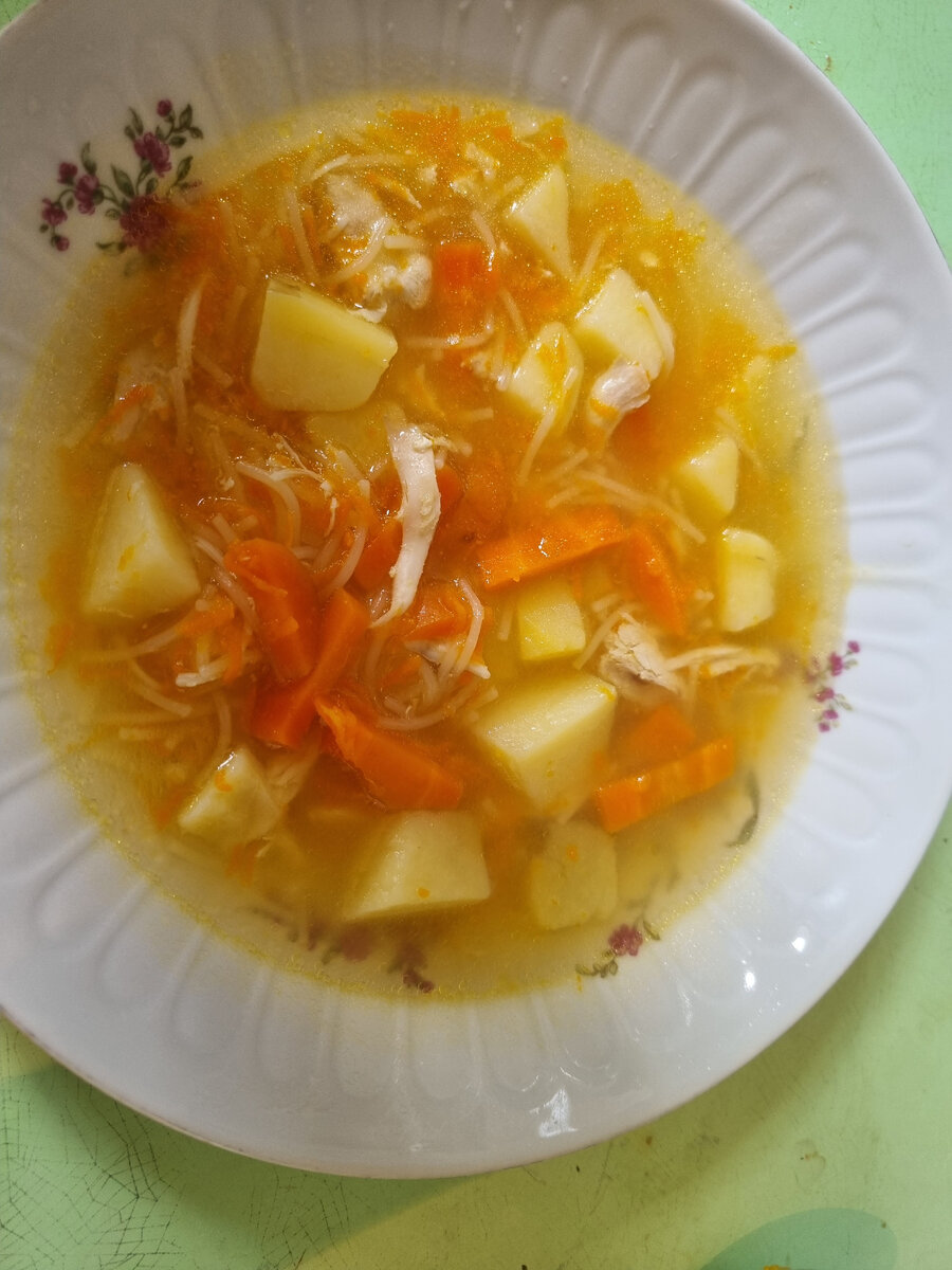 Лёгкий суп с вермишелью Очень вкусный лёгкий суп с вермишелью. Который готовится очень просто. Подойдёт для тех, кто не хочет заморачиваться над сложными блюдами Или для тех, кто хочет устроить разгрузочный день для себя и для своей семьи. Так же данный суп подойдёт для детей Так как он не содержит пережарку. Для приготовления данного супа много ингредиентов не потребуется. Поэтому я абсолютно уверен, что данные продукты можно найти у каждого в холодильнике. Ингредиенты. 1 филе, куриное или грудка 2 морковь. 1 или 2 штуки. 3 картошка, 3 штуки. 4 вермишель, мелкая. 100 грамм. 5 соли, 2 чайной ложки. 1 этап Перекладываем курицу в кастрюлю, заливаем водой и начинаем варить. Добавляем соль по вкусу. Доводим до готовности, вытаскиваем наше мясо. Даём остыть и режем кусочками. 2 этап Нарезаем картофель на маленькие кубики и добавляем в бульон, начинаем варить 30 минут. Затем добавляем мясо. 3 этап. Нарезаем морковь соломкой. И половина морковь натираем на мелкой тёрке. Затем добавляем все