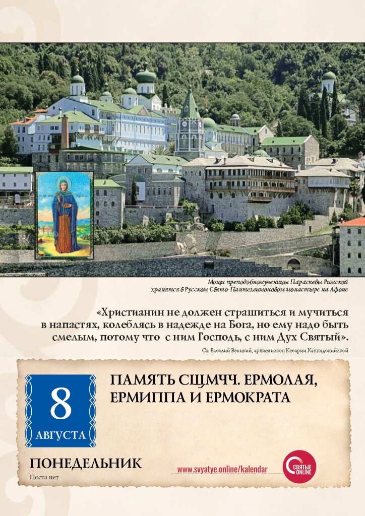 Преподобномученица Параскева была единственной дочерью родителей-христиан и с молодых лет посвятила себя Богу. Живя в Риме, в родительском доме, она много времени уделяла молитве и изучению Священного Писания. После смерти родителей святая Параскева раздала все свое имущество нищим, приняла иночество и, подражая святым апостолам, начала проповедовать язычникам о Христе. О ее деятельности было донесено императору Антонину Пию (138–161), и святая Параскева предстала перед судом. Бесстрашно исповедала она себя христианкой. Ни обещания почестей и материальных благ, ни угрозы мучениями и смертью не поколебали твердости святой и не отвратили ее от Христа. Она была предана зверским истязаниям. Ей на голову надели раскаленный шлем и бросили в котел с кипящей смолой. Однако силой Божией святая мученица осталась невредимой. Когда император заглянул в котел, святая Параскева бросила ему в лицо несколько капель раскаленной смолы и он ослеп. Император стал просить ее об исцелении, и по молитве свят
