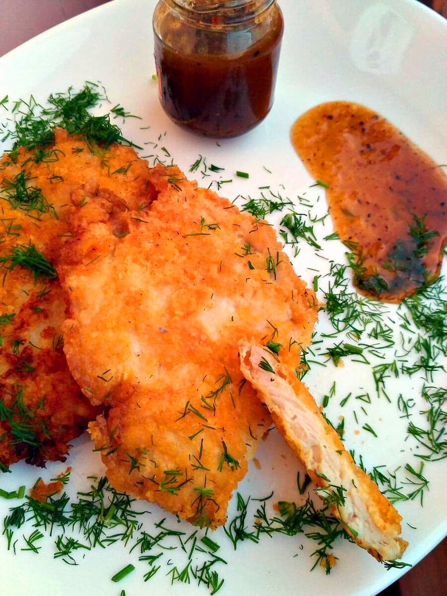Куриные отбивные, в сырной панировке, с соусом из белого муската.