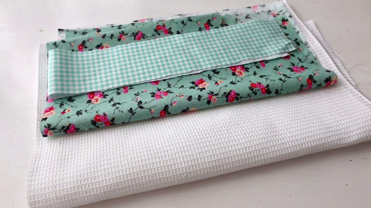 Для изготовления своего полотенца взяла белую вафельную ткань 35х40 см и цветную бязь.
