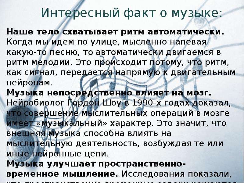 Чем больше человек прослушивает музыку, тем лучше становятся его умственные способности и память.