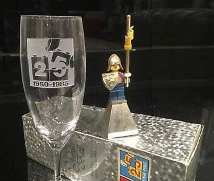 Продажи LEGO в Великобритании начались в конце января 1960 года. В январе 1985 года британский офис LEGO провел в Лондоне гала-концерт, посвященный 25-летию этого события. Подарком каждому участнику стал бокал для шампанского с нанесенной памятной надписью и рисунком, а также специальная хромированная минифигурка классического рыцаря LEGO. Известно, что таких экземпляров было выпущено всего несколько сотен. Однако трудно сказать, сохранились ли экземпляры этого сувенира до сегодняшних дней. В продаже чуть менее года назад находился всего один, проданный за баснословные 3000$. Нигде больше хромированный шлем и щит для серии LEGO Castle не появлялся.