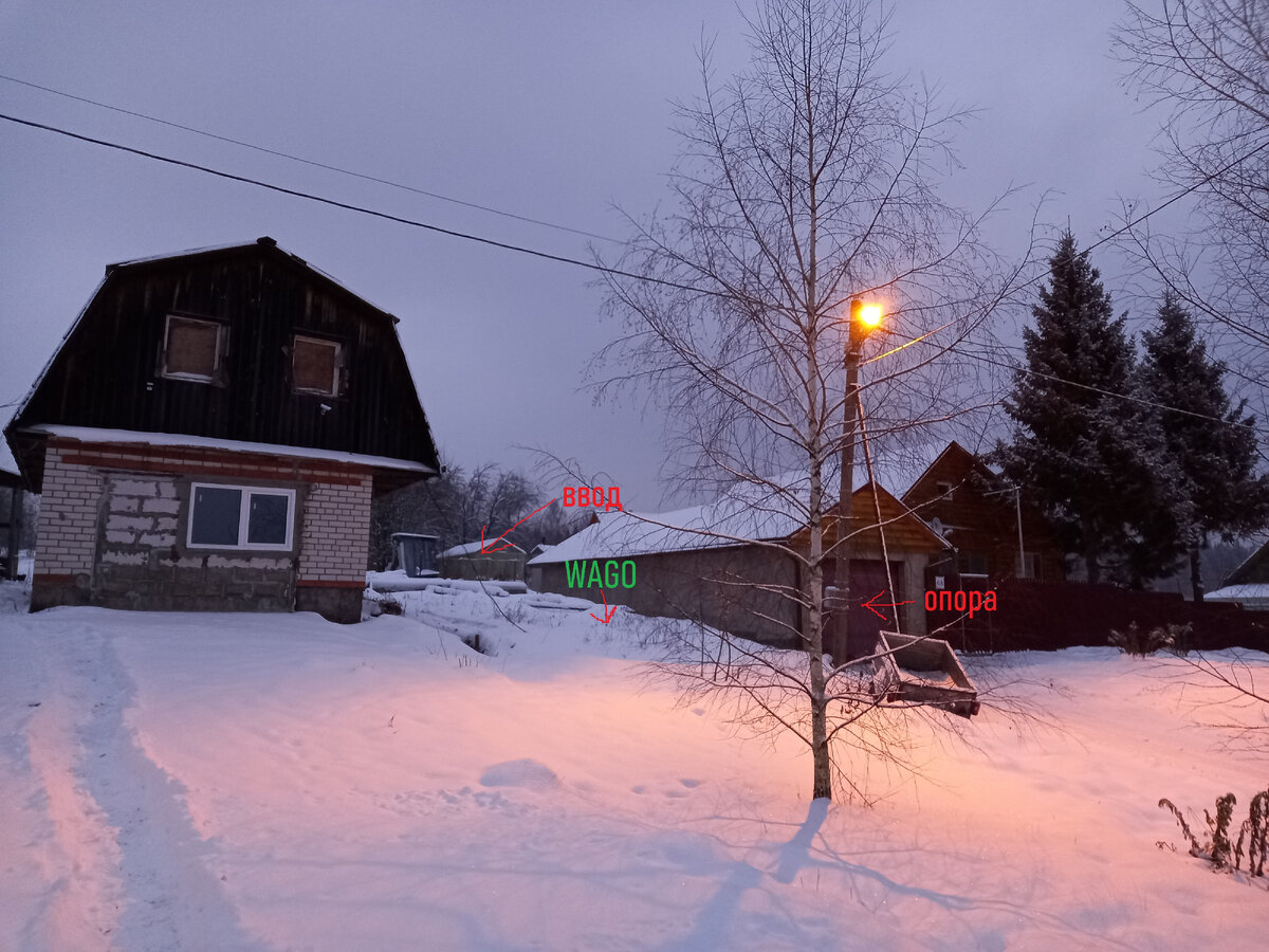 Выглядело это всё примерно так: От щитка на опоре провод опускался вниз, и затем он лежал в снегу(именно там он соединялся с кабелем клеммами), а после поднимался в строение, на фото вы всё наглядно видите.