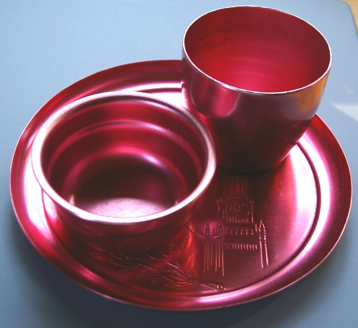Набор посуды для бритья из анодированного алюминия Ступинского металлургического завода (СМЗ), 1959 год. Заводское клеймо - казан с ушами. Что в казане, не известно. Фото вышло не очень. Вот как должно выглядеть их клеймо. "Спецвыпуск" посуды для бритья был приурочен к первому в мире межпланетному перелету. Удачный запуск состоялся 12 сентября 1959 года, с пятой попытки. На поверхность Луны были доставлены отполированные алюминиевые шары диаметром 15 и 9 сантиметров, "вымпелы". Шары были сложены из пятиугольных сегментов, отчеканенных Ленинградским монетным двором.. "На каждый шар приходилось по 72 пятиугольника двух видов – правильной (12 шт.) и неправильной формы (60 шт.). Внутри полых шаров размещалась взрывчатка. Имелся ударный взрыватель, который срабатывал при ударе о поверхность Луны. При взрыве вымпелы разлетались во все стороны, как осколки. Энергия взрыва должна была погасить хотя бы у некоторых из них скорость падения, и они должны остаться лежать на поверхности" (с сай