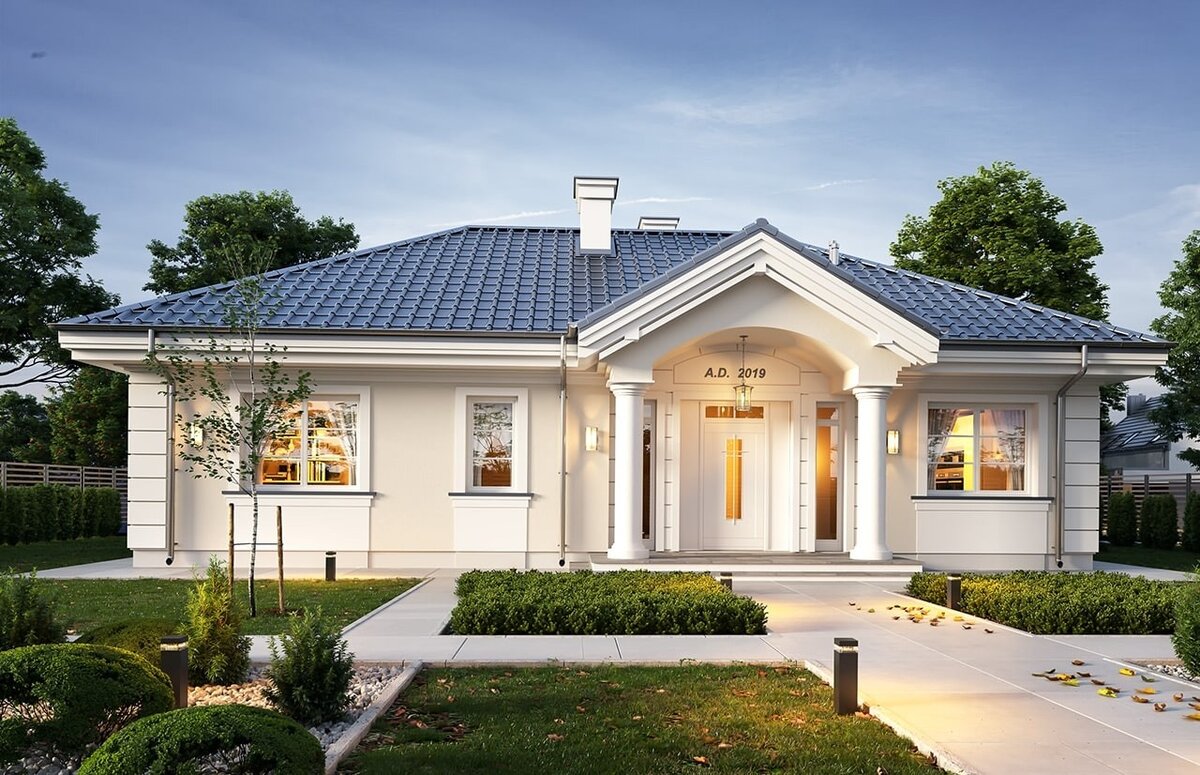 Удобный одноэтажный дом для семьи из 4-5 человек. Полезная площадь дома составляет более 101 м.2. Дом покрывает многоуровневая крыша. Здание спроектировано в прямоугольной форме, покрыто четырехскатной крышей и дополнено двумя поперечными навесами. Фасад дома украшает элегантное крыльцо, поддерживаемое двумя колоннами с презентабельной входной дверью и боковыми окнами. Пропорции здания, материалы и детали создают элегантную высококачественную архитектуру. Интерьер здания разделен на дневную - с гостиной, вестибюлем и кухней, а также ночную часть. В доме предусмотрено четыре комнаты (спальни). 40-метровая гостиная соединяется с кухней, обеденным уголком и каминной стеной. Открытый потолок над гостиной добавляет ощущение воздушного пространства.