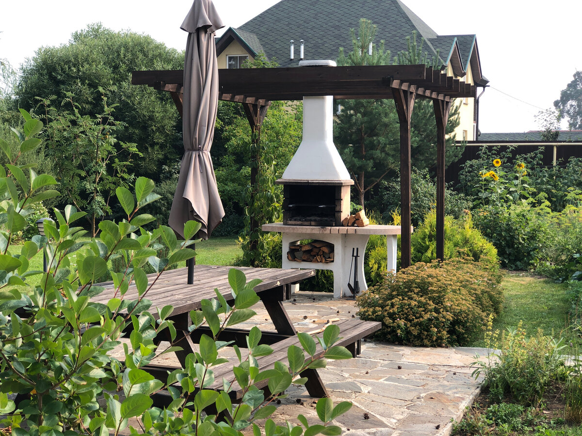У любого садовода, обдумывающего обустройство своего участка, обязательно есть какие-то формы и элементы, которые хотелось бы привнести в свой сад. Это может быть мостик над сухим ручьем, зона отдыха с шезлонгами, пруд или садовые качели. Из таких деталей складывается образ сада, сначала в голове, возможно на бумаге, а затем и на местности. Меня привлекла пергола. Конечно, в нашей климатической зоне, а мы живем на Урале, в окрестностях Екатеринбурга, пергола не является очевидной и оправданной с точки зрения прямой функции конструкцией. Ведь чаще всего нам нужна не защита от палящего солнца, а продуманные посадки для избежания излишнего затенения участка. Солнечных дней в году гораздо меньше, чем в южных странах, где перголы устанавливают даже над дорожками, чтобы передвигаться в тени. Поняв, что пергола на участке мне совершенно необходима, я стала думать, где же ее установить. Место справа от теплицы было занято уличным очагом, который одним из первых появился на участке. Такой очаг