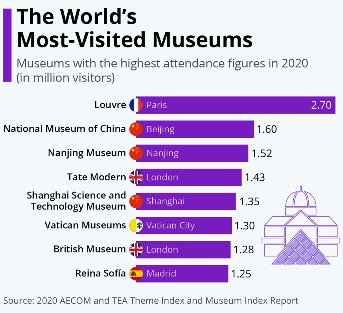 Всем привет👋 Сегодня разберем картинку о самых посещаемых музеях! Несмотря на ограничения на поездки, комендантский час и закрытие туристических достопримечательностей по всему миру из-за пандемии коронавируса, в 2020 году выставки Лувра посетили 2,7 миллиона человек. Как показывает наш график, претенденты на звание самого посещаемого музея в прошлом году на самом деле и близко не подошли. На втором месте находится Национальный музей Китая, расположенный в Пекине, который посещают около 1,6 миллиона человек. Музей является результатом слияния в 2003 году Музея китайской революции и Национального музея истории Китая, которые были основаны в 1950 и 1912 годах соответственно. Даже если судить о его возрасте по старейшему отделу, возглавляемое государством учреждение по-прежнему является самым молодым в списке. Музеи Ватикана, с другой стороны, находятся лишь на шестом месте по количеству посетителей, но были основаны папой Юлием II в 1506 году, что делает их одним из старейших до сих пор