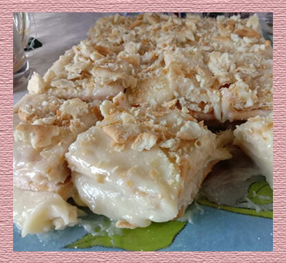 Печенье для этого торта нужно брать такое, как крекер (можно солёный), но без привкусов или слоёное. Печенье не должно быть сильно сладким. В кастрюле соединяю 250 мл молока и сахар. В другой ёмкости развожу муку и ванилин в 250 мл молока, добавляю соль, размешиваю так, чтобы не было комков. Отправляю кастрюлю с молоком и сахаром на средний огонь, постоянно мешаю, чтобы не пригорело. Сахар растворился – вмешиваю молоко с мукой. Довожу до загустения. Оставляю кремовую основу до полного остывания при комнатной температуре. Можно остудить поместив кастрюлю в другую ёмкость с холодной водой. В остывшую основу тщательно вмешиваю венчиком мягкое сливочное масло до однородности. Вот таким получиться крем. Намазываю небольшое количество крема на 1 штуку печенья и укладываю её на плоское блюдо кремом вниз. Выкладываю прямоугольник 3 шт. на 4 шт. Итого в каждом слое у нас получается 12 шт. в 3-х слоях – 36 шт. Первый и второй слой выложенного печенья щедро смазываю кремом. Уложив третий слой обм