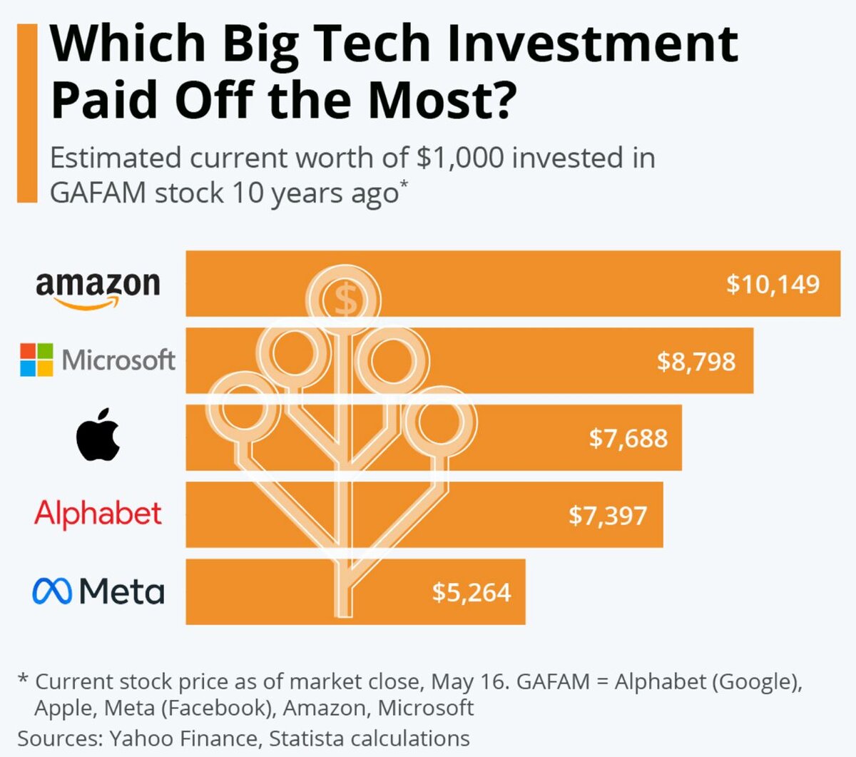Всем привет👋 Сегодня разберем картинку о прибыльных инвестициях! 18 мая 2012 года Марк Цукерберг обнародовал Facebook в ходе крупнейшего первичного публичного размещения акций (IPO) в истории технологий того времени. По данным CNN, на момент закрытия торгов было продано 567 миллионов акций по средней цене 38 долларов за акцию, что превысило рекорд самого крупного первого торгового дня, установленный General Motors в 2010 году примерно на 120 миллионов акций. Сейчас компания Цукерберга называется Meta, а акции торгуются по цене 200 долларов. Как эти доходы соотносятся с крупными технологическими конкурентами Meta и какие акции стали самыми прибыльными за последние десять лет? Как показывает наш график, основанный на данных расчетов Yahoo Finance и Statista, инвестиции в Amazon окупились бы больше всего при сравнении цен сегодняшней и десятилетней давности. Инвестирование 1000 долларов 17 мая 2012 года привело бы к сегодняшнему доходу в 10 149 долларов. На втором месте находится Microso