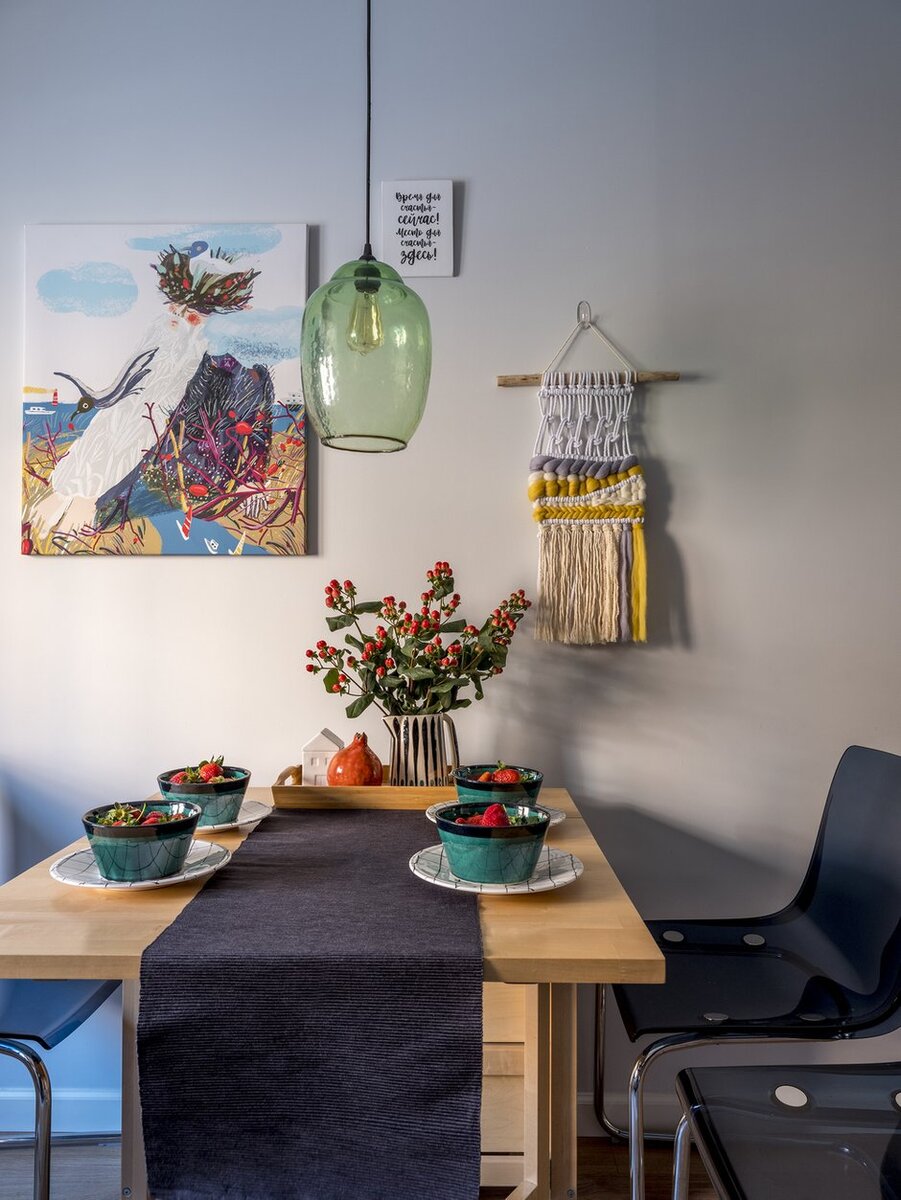 Вкратце Квартира расположена в ЖК «Город Набережных», его территорию рассекают каналы, а снаружи комплекс окружен лесом и рекой. Дизайнеру Кате Чистовой хотелось, чтобы будущий интерьер был в гармонии с природой, поэтому для него выбрали оттенки земли, неба, зелени и солнца, а также натуральные материалы — дерево, гальку, ротанг, керамику и натуральные ткани. Подробности Работу над проектом квартиры для семьи с ребенком начали с перепланировки. «Пространство было весьма непростым, с тупыми и острыми углами, которые нужно было как-то обыграть», — рассказывает дизайнер. Дальнюю комнату отдали под спальню родителей, к ней примыкают гардеробная и санузел. Напротив — кухня. Остальное пространство разделили между детской и гостиной. Плюс обустроили узкую, но вместительную ванную комнату. В итоге практически все помещения получились правильной формы, а в остальном помогла грамотная расстановка мебели. Сделать интерьер кухни интереснее помог необычный фартук из плитки в виде чешуи — смотрится