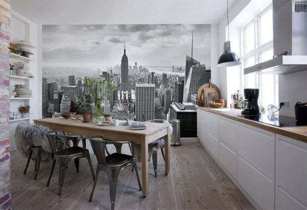 Давайте разберем очевидные вещи, которые могут испортить общее впечатление и сильно удешевить интерьер вашей кухни. Если заметили их на своей кухне, забирайте варианты решения. Ну а если только планируете ремонт, то уделите особое внимание этим мелочам. Именно они в итоге могут доставить неприятные эмоции. 1. Крупные принты или фотообои Такое решение периодически возвращается в интерьерную моду, но ненадолго. Поэтому выбор в пользу фотообоев будет весьма неудачным в случае долговременного ремонта. Также не рекомендуем использовать фотопечати на натяжных потолках и полах. Как бы ни хотелось видеть ясное небо, пальмы и виноградные арки на кухне, грамотно вписать их в интерьер комнаты вряд ли получится. Кухня будет проигрывать общей стилистике интерьера квартиры и удешевлять впечатление от ремонта. Решение: если необходимо сделать акцент, то советуем использовать цветовые сочетания или фактуры. Также акценты можно расставить с помощью картин или постеров. Дизайн: Айгуль Султанова 2. Жалюз