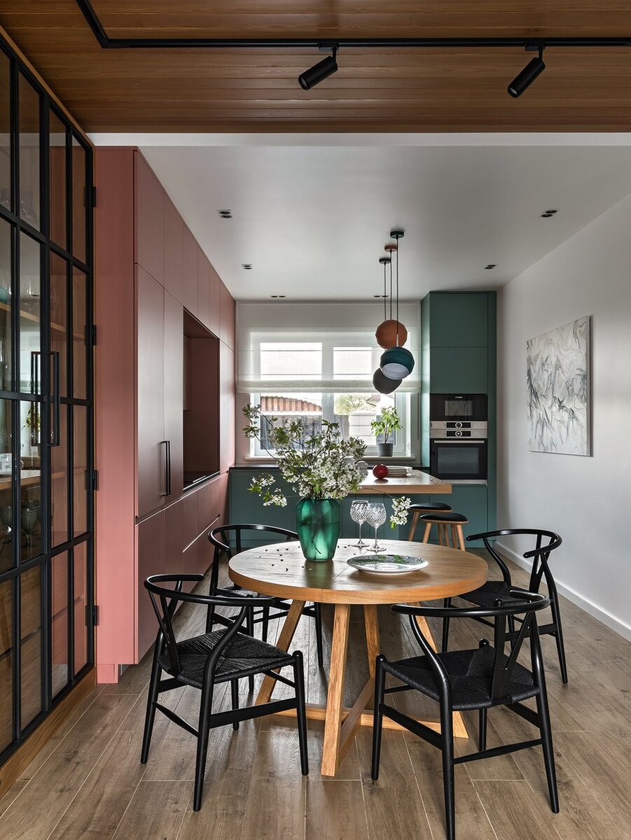 Зоной, объединяющей кухню и гостиную, служит обеденная группа с круглым раскладным столом, выполненным по чертежам дизайнеров из массива дуба. Высокий шкаф-витрина со стеклянными фасадами отлично сочетается с дверями в кабинет.
