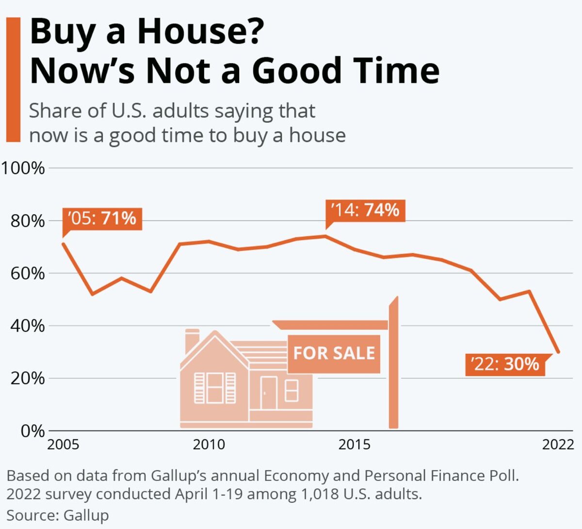 Всем привет👋 Сегодня разберем картинку о ценах на недвижимость! Американцы, желающие купить дом, в настоящее время сталкиваются с почти идеальным штормом неблагоприятных условий. Мало того, что трудно найти дом, так еще и все труднее его себе позволить. Исторически высокие цены на жилье в сочетании со ставками по ипотечным кредитам, которые стремительно снижаются с недавних минимумов, вызывают серьезную головную боль у потенциальных покупателей жилья. Последние результаты ежегодного опроса Gallup по экономике и личным финансам показывают, что нынешние условия действительно испортили аппетит американцев к покупке домов. Опрос этого года, проведенный 1-19 апреля, показывает, что только 30 процентов взрослых американцев считают, что сейчас самое подходящее время для покупки дома – это более чем на 20 процентных пунктов меньше, чем 53 процента в 2021 году. По данным Gallup, это самый низкий уровень доверия с тех пор, как этот вопрос был впервые задан в 1978 году. Фактически, доля людей, с