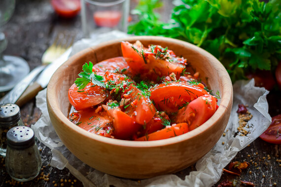 Доброго времени суток, уважаемые читатели! Сегодня я хочу поделиться с вами очень вкусной закуской из помидоров. Урожая на грядках много, а куда девать, многие уже и не знают. Поэтому берите этот рецепт на заметку, уверен, он понравится многим. Особенно тем, кто любит поострее И так, начнём Ингредиенты: Помидоры 2 кг Морковь среднего размера 4 шт Перец болгарский 5 шт Масло растительное 100 г Уксус 9%-ый 100 г Чеснок 100 г Перец горький 1 шт Соль 2 ст л Сахар 100 г Петрушка, укроп по вкусу Способ приготовления: Помыть все овощи, обсушитьПомидоры, если маленькие, нарезать на 2 части, если большие то долькамиТак же с помидоров можно снять кожуру (лучше это сделать так - облить кипятком и снять её руками) Остальные овощи (морковь, болгарский и острый перцы, чеснок ) нужно почистить, у перцев убрать внутренности. Их мы пропускаем через мясорубку, так они будут в закуске чувствоваться нежнее Зелень укроп и петрушку мелко нарезать и перемешать с перекрученными ово