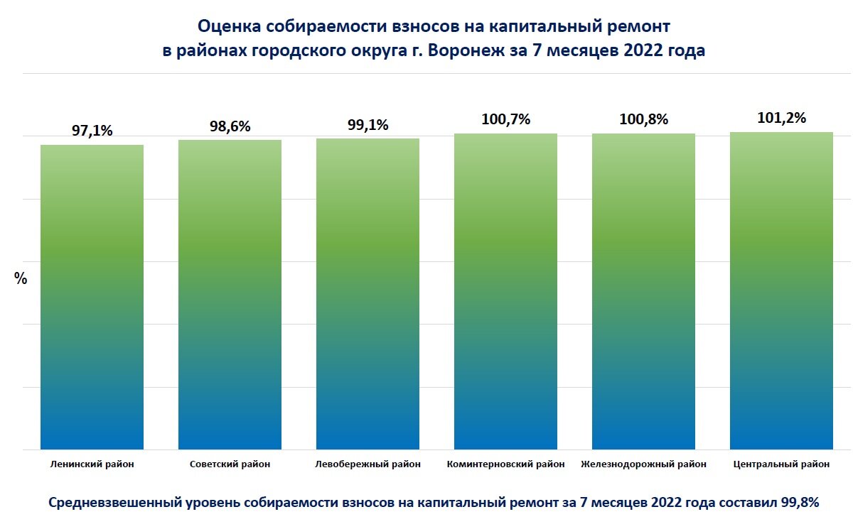 В регионе сохраняется высокий уровень собираемости взносов на капитальный ремонт. За 7 месяцев 2022 года собственники помещений в многоквартирных домах Воронежской области уплатили 99,5% начисленных взносов на капремонт. Самый высокий уровень собираемости взносов за 7 месяцев 2022 года отмечен в Каменском (110,9%), Новоусманском (109,4%), Семилукском (106,8%), Павловском (105,6%), Эртильском (104,3%), Верхнемамонском (103%), Ольховатском (102,6%), Каширском (101,7%), Острогожском (101,6%), Терновском (100,6%), Лискинском (100,3%) и Кантемировском (100,3%) районах. В г. Воронеже собственники помещений в многоквартирных домах уплатили 99,8% начисленных взносов на капремонт. В 15 муниципальных образованиях собираемость взносов на капитальный ремонт составила от 95,1% до 99,8%, в 6 районах области собственники помещений в многоквартирных домах уплатили от 89,3% до 94,4% начисленных взносов. В Грибановском районе собираемость взносов на капитальный ремонт составила 56,9%. Воронежская област