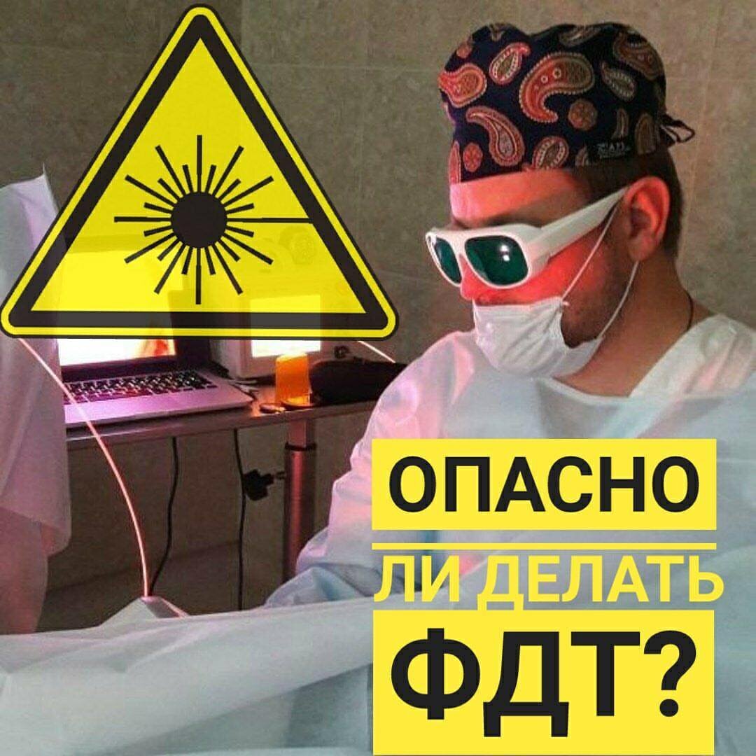 Излучение от лазера во время фотодинамической терапии если и опасно, то только для глаз, поэтому вы меня и видите часто на фотографиях в защитных очках. На организм лазерное излучение такой опасности, как, например, рентгеновские лучи, НЕ ОКАЗЫВАЕТ! Я вам больше скажу, если предварительно не вводить фотосенсибилизатор, то даже если светить часами лазером, который используется для ФДТ, с тканями ничего не произойдет. Но! Меры безопасности после операции ФДТ все же есть и строго требую их соблюдения. На протяжении 2 дней после фдт необходимо: 1. носить солнцезащитные очки 2. Отказаться от просмотра телевизора 3. Избегать работы на компьютере, не смотреть в планшеты, смартфоны 4. В домашних условиях допускается освещенность не более 50 люкс. 5. По возможности не подвергаться солнечному воздействию. Соблюдение такого светового режима необходимо потому, что фотосенсибилизатор, который вводится внутривенно, повышает чувствительность к свету весь организм, особенно глаз. В течение 3-4 неде