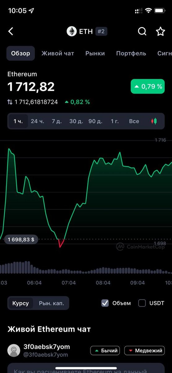 Сегодня открыл позицию по Ethereum напомню вход был по 1712 закрыл позицию в 18 вечера (МСК+2ч) Итог дня +5,35% Так то нифига себе!