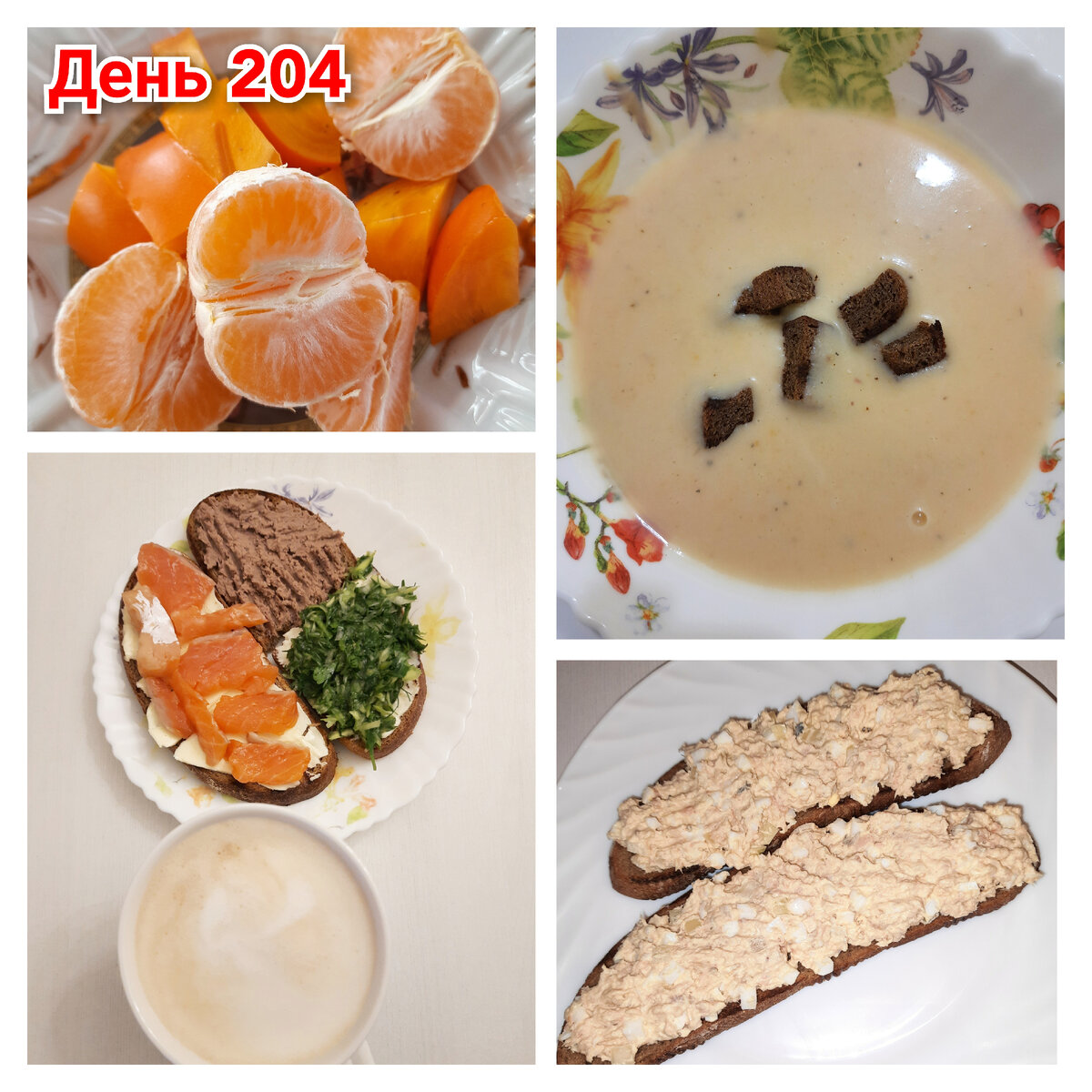 #Завтрак – кофе со сливками и сахаром 15г. Дарницкий хлеб на гриле, сливочное масло, слабосолёная семга. На втором половинчатом тосте – творожный сыр и зелень (петрушка, укроп, зеленый лук – измельчить в комбайне-чаше блендера, немного солю и заправляю оливковым маслом). А на второй половинке – паштет из печени (из фермерской лавки). #Обед – тосты на гриле и салат-намазка из сыра. 3 яйца заранее отвариваю и тру на мелкой терке, примерно 150г сыра тертого (где-то 1 к одному с яйцами должен быть баланс, а 1 яйцо это 50г), пара зубчиков чеснока через пресс. Заправляю майонезом, не взвешивала, смотрю по консистенции. Это такое классическое сочетание, а вот название такого салата я не знаю, может кто-то подскажет? #Десерт – мандарин и хурма. #Ужин – сырный #суп-пюре. В кастрюлю, в которой буду потом варить, наливаю ложку подсолнечного масла и обжариваю крупно порезанные кубиком морковь, лук и картофель. Заливаю водой до половины кастрюли, варю минут 15, до готовности картошки, затем добавля