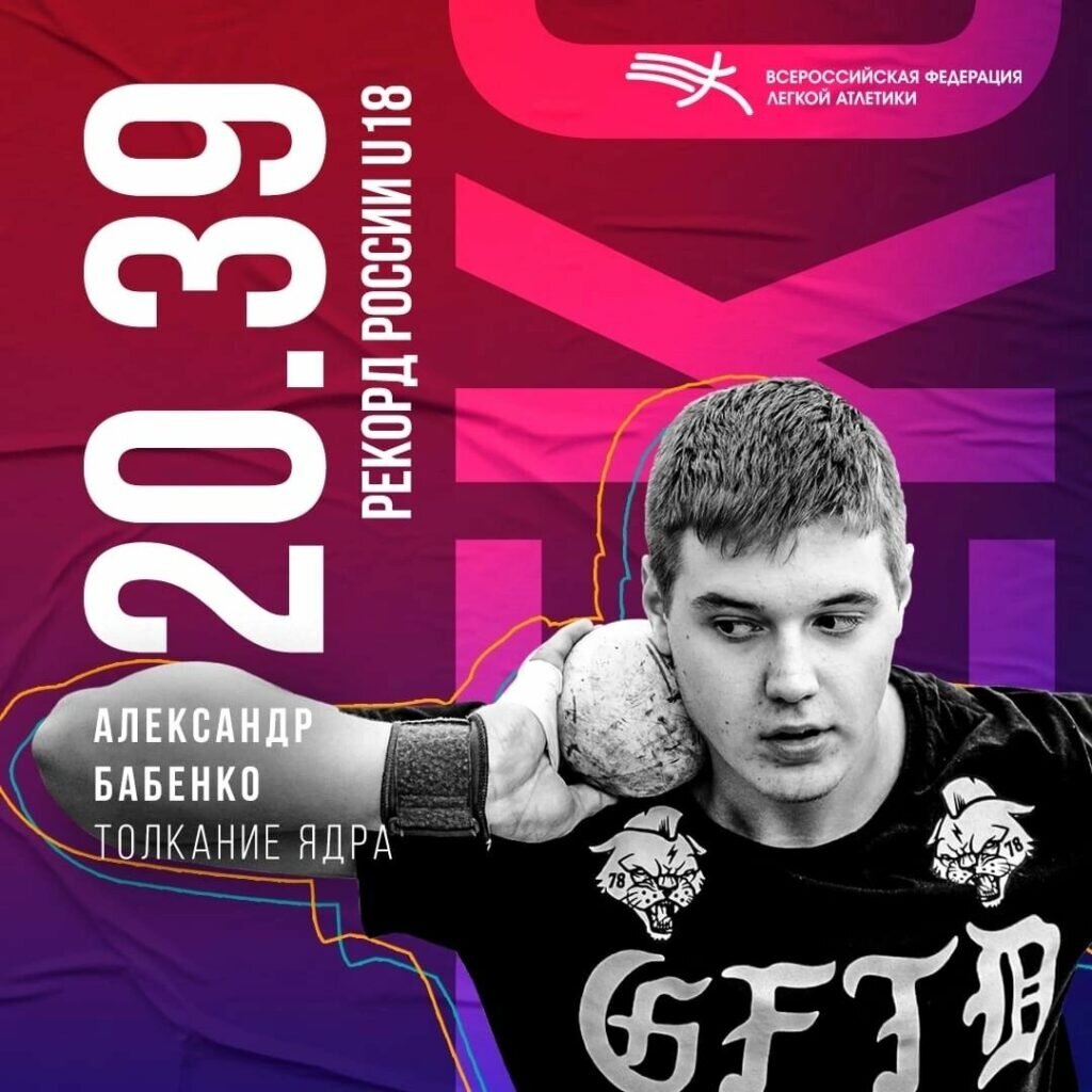 Президиум Всероссийской федерации лёгкой атлетики утвердил рекорд России среди юношей U18 в толкании ядра, который установил брянский спортсмен Александр Бабенко на первенстве России, став победителем соревнований. Как сообщала «Брянская Губерния», они проходили в Челябинске в конце июня на легкоатлетическом комплексе имени Елены Елесиной. Воспитанник Александра Черникова из спортшколы олимпийского резерва имени В.Д. Самотесова Брянска Александр Бабенко в первой же попытке отправил 5-килограммовый спортивный снаряд на 20.39 метра. Этот результат на тот момент был третьим в Европе и рекордным для российских атлетов в возрасте до 18 лет. Кстати, предыдущее достижение принадлежало Алексею Чижеликову и было установлено в 2012 году. Он метнул снаряд тогда на 20.34 метра.