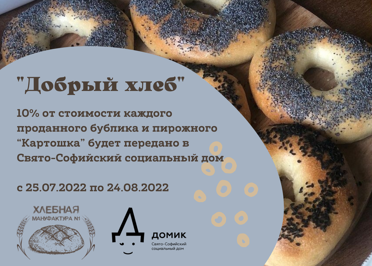 Помните, какой была выпечка в вашем детстве? Ароматная, она долго сохраняла свой неповторимый вкус. Сегодня вы можете вспомнить детство и попробовать ту самую выпечку! С 25 июля по 24 августа пройдет благотворительная акция от пекарни “Хлебная мануфактура №1” в поддержку наших особых ребят. В этот период 10% от стоимости каждого проданного бублика и пирожного “Картошка” будет передано в Домик. "Хлебная Мануфактура №1" - ремесленная пекарня, возрождающая традиции старинного хлебопечения, расположена в центре Москвы по адресу: ул. Пятницкая, 57 стр. 2. Хлеб в пекарне изготавливается по старинным авторским рецептам исключительно на закваске, без использования дрожжей. Ежедневно в пекарне выпекают до двадцати разновидностей хлеба: от классической чиабатты и бородинского хлеба, до немецких брецелей и турецких симитов. А еще - вкуснейшие пирожные, тонкое французское печенье с миндалём, английские сконы, андалузское печенье, итальянские кантуччи и панеттоне, бублики, рогалики и другие хлебные