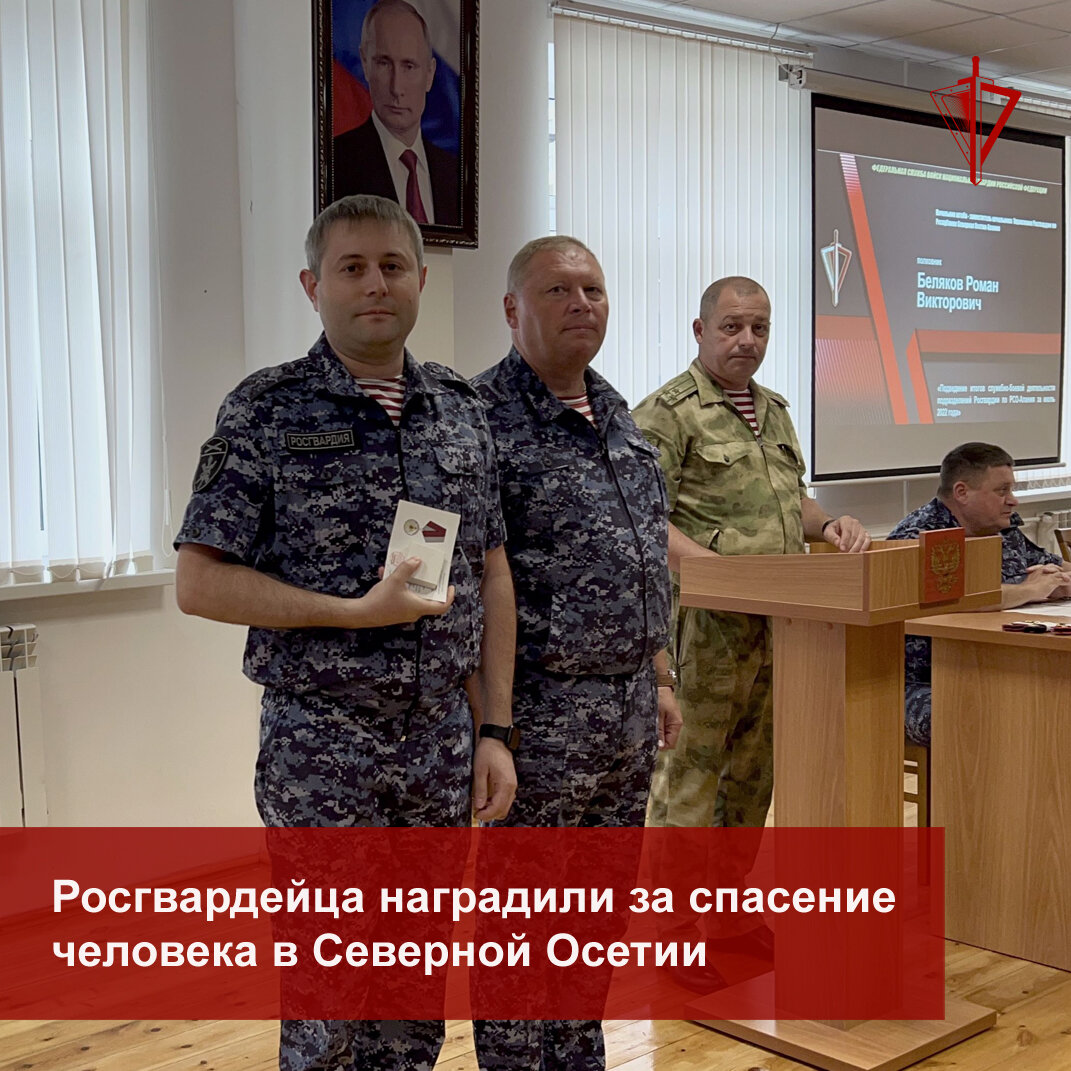 Начальник Управления Росгвардии по Республике Северная Осетия-Алания полковник полиции Валерий Голота вручил ведомственную медаль «За спасение» сотруднику отдела государственного контроля территориального органа капитану полиции Руслану Загалаеву. Заслуженную награду росгвардеец получил за спасение пожилого человека из горящей квартиры.