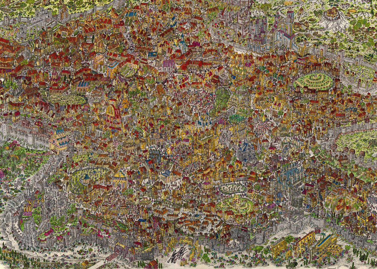 Рассмотреть поближе можно по этой ссылке https://vk.com/wall730204620_9?browse_images=1 Эту работу я начал год назад. Она так насыщенна деталями, что мой долг рассказать об истории, ЛОРе и смысле каждой них. Ну так приступим Второпях. Абы как. С кривыми линиями и раскраской. Дома-Фаза I (Тип A) (Просто жёлтые стены с оранжевыми крышами ) Я задался целью, проверить, что, если я буду каждый день, рисовать несколько домиков. Этакий эксперимент на дисциплину. С маленькими, но постоянными усилиями нарисовать целую картину на ватмане. Дома-Фаза I (Тип Б) (Жёлтые стены с синими крышами + колонны из розового мрамора) То есть я подходил к рисунку. И не пытаясь рисовать красиво накидывал гелевой ручкой контуры, а затем разукрашивал. Видно что линии кладутся поверх друг друга, неаккуратно и грязно. Лишь бы нарисовать. Качество неважно. Обычная статуя со всадником (Для общего плана) и меньшего размера во дворе Люди-Фаза I (Чёрные силуэты. Почти в пропорции с домами) + еле заметные элеме