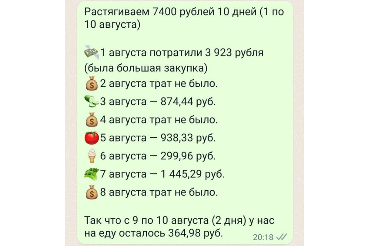 Погодите писать про нищету, бедность и спрашивать реквизиты для перевода пожертвований: деньги на еду и на всё остальное у нас лежат отдельно. На продукты в августе мы решили не тратить больше 23 000 рублей. Разделили эту сумму на три части. Так вот от первой из них и осталось 360 рублей (на 2 дня).