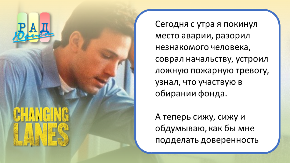ПОЗДНЕЕ УТРО ПОНЕДЕЛЬНИКА. Солнце, чистое небо. Шлёпанье бегущих сланцев, детский смех и что-то звонкое девичьим голосом на одном из языком Кавказа (дети везде дети). На столик с призывным звоном о блюдце становится чашка. Ктулху откладывает свой Зов (Его зов или зов к нему? Мистер Лавкрафт, можете уже наконец пояснить?) и пытается дотянуться до планшета. Впереди почти целый месяц отпуска, чайничек свежезаваренного чая и фильм о юристах. РОДЖЕР МИЧЕЛЛ СНИМАЕТ РАЗНОЕ КИНО. Недавно мы с Викой пересматривали его «Нотинг-Хилл» – романтическую комедию с красавцем (я о его амплуа как актера) Хью Грантом и красоткой (я об одной из её киноработ) Джулией Робертс. О «Нотинг-Хилле» я хотел написать… еще напишу. Потом. Changing Lanes можно перевести по-разному. В названии используется игра слов. Все отечественные локализации предлагают варианты названия, связанные с автомобильным движением – «Меняя маршруты», «В чужом ряду», «На чужой полосе». Не удивительно. Начало истории, сюжета, его иницииру